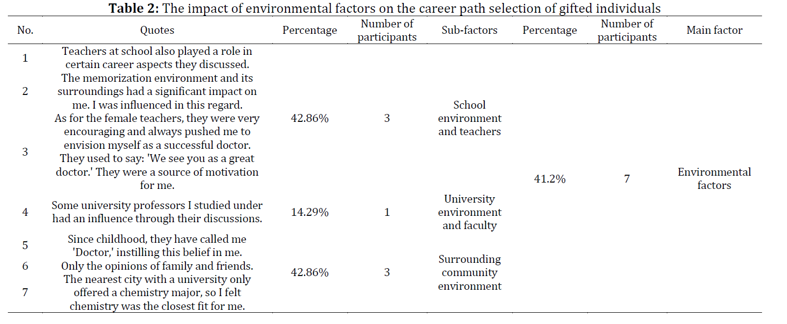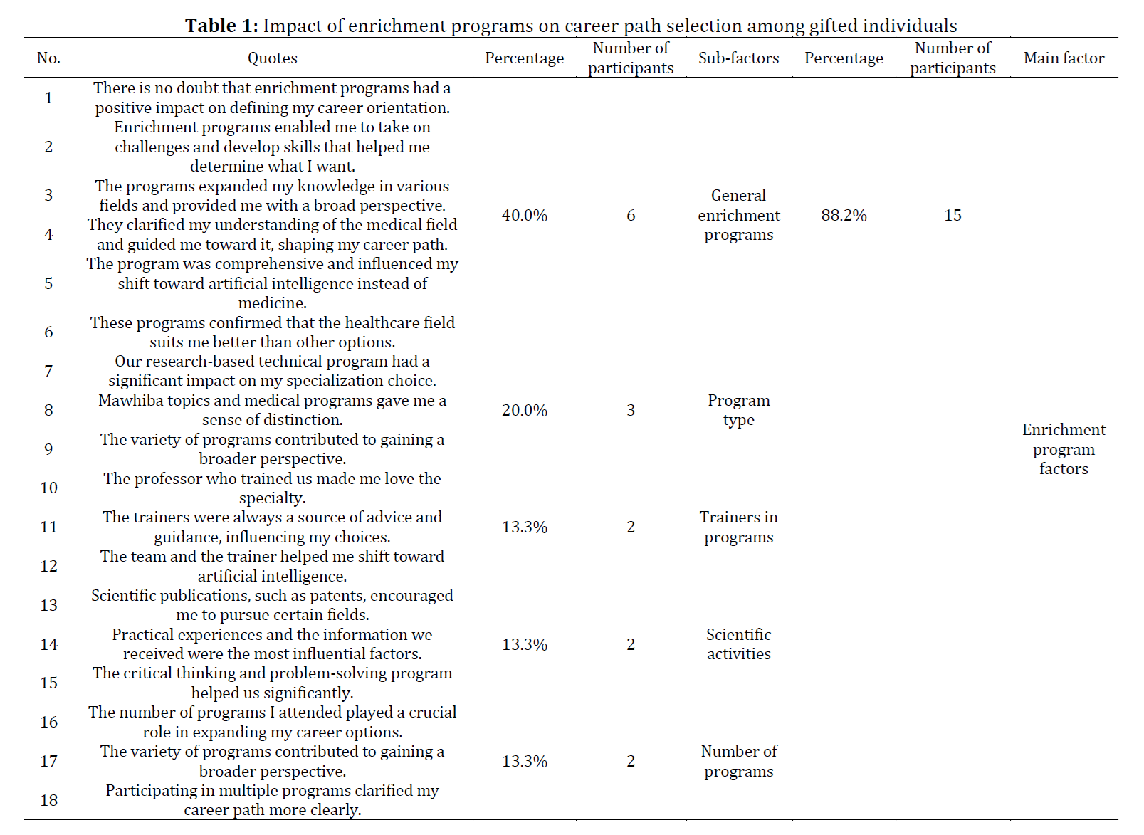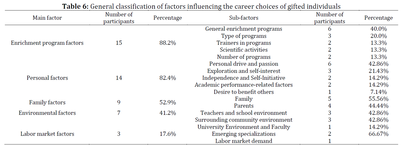 This study investigated the factors influencing career decisions among gifted individuals, with particular attention to the role of enrichment programs. It examined how personal environments and academic backgrounds contribute to career choices using a quantitative research design. The findings revealed that 82.4% of participants selected their careers based on personal interest, while 52.9% identified family support as a significant influence. Environmental elements such as teachers and societal expectations affected 41.2% of respondents, and 17.6% considered labor market conditions in their decision-making. Only 14.29% reported that academic performance, particularly grade point average (GPA), restricted their choice of specialization. These results underscore the value of enrichment programs in enhancing students’ awareness of career pathways and their ability to align aspirations with capabilities. The findings suggest that such programs should be developed in coordination with families and schools and include practical learning experiences. Future research should assess the long-term effects of enrichment programs and propose strategies to reduce the gap between students’ preferred careers and labor market demands.
