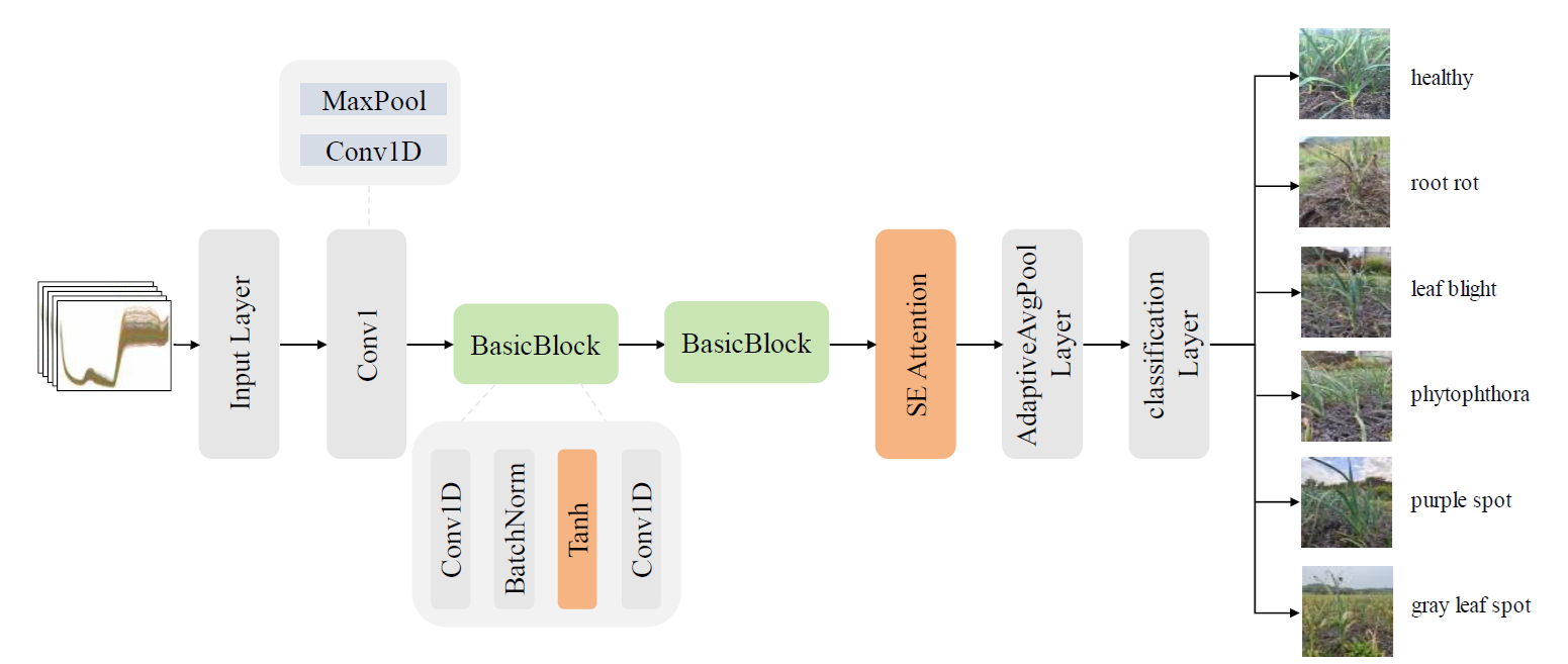 Early detection of garlic diseases is essential for improving agricultural quality and productivity. This study presents a novel garlic disease identification model based on near-infrared (NIR) spectroscopy and a convolutional neural network, named ST-1DResNet (One-dimensional Residual Networks with Squeeze-and-Excitation and tanh activation). The model overcomes the vanishing gradient problem, adaptively adjusts channel weights, and efficiently extracts spectral features without requiring preprocessing or manual feature extraction. Experimental results show that ST-1DResNet achieves a classification accuracy of 97.75%, outperforming the original ResNet and four classical deep learning models by an average of 6.40%. Compared with traditional machine learning methods and optimized SVM models, it improves accuracy by 11.63% and 2.67%, respectively. The model is compact, computationally efficient, and supports fast training, making it suitable for deployment in resource-limited environments. Its strong generalization performance, validated using an external mango dataset, highlights its scalability. Overall, ST-1DResNet provides a practical, accurate, and non-destructive approach for crop disease detection, contributing to quality control and intelligent diagnosis in modern agriculture.
