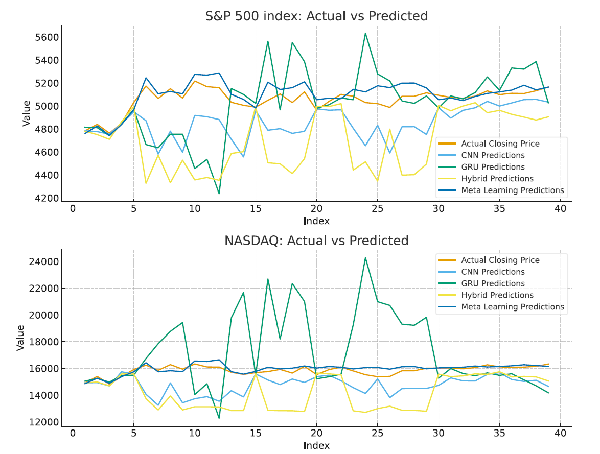 In the era of advanced computational techniques and predictive modeling, the focus has shifted toward reducing latency and minimizing costs. Financial market prediction is not a novel concept, as it has been applied effectively over the past decades to support informed decisions by traders and investors, leading to improved returns. However, machine learning and deep learning models often demand substantial computational power and processing time due to their complex architectures. Meta-learning provides an efficient alternative by reducing computation time and resource requirements for financial forecasting. This study proposes a meta-SGD model to predict future prices of the S&P 500 index and NASDAQ, and compares its performance with deep learning models (CNN and GRU) and a hybrid CNN-GRU model. Evaluation using RMSE, MAE, and R² metrics shows that the meta-learning model outperforms both deep learning and hybrid models, achieving state-of-the-art predictive accuracy with significantly lower computational cost.