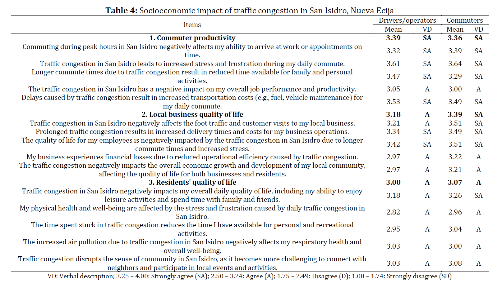 This study investigated the causes and impacts of traffic congestion in San Isidro, Nueva Ecija, Philippines, using a descriptive research design with 114 respondents (38 drivers/operators and 76 commuters) selected through convenience sampling. Vehicle counts at the National Highway and Public Market identified peak traffic hours, while a validated and reliable researcher-designed questionnaire gathered views on congestion, socioeconomic effects, and mitigation measures. Results showed that narrow roads, poor infrastructure, and weak enforcement of traffic rules were the main causes of congestion, leading to longer travel times, stress, and higher fuel costs for both commuters and businesses. Although both groups recognized its negative socioeconomic effects, their opinions differed on the effectiveness of existing measures, which were generally seen as ineffective. The study recommends strengthening road infrastructure, improving public transport, enforcing traffic regulations, and adopting demand management strategies such as carpooling incentives and congestion pricing. It emphasizes the need for integrated urban planning, multi-sectoral collaboration, and continuous policy review to reduce congestion and enhance the quality of life in San Isidro.