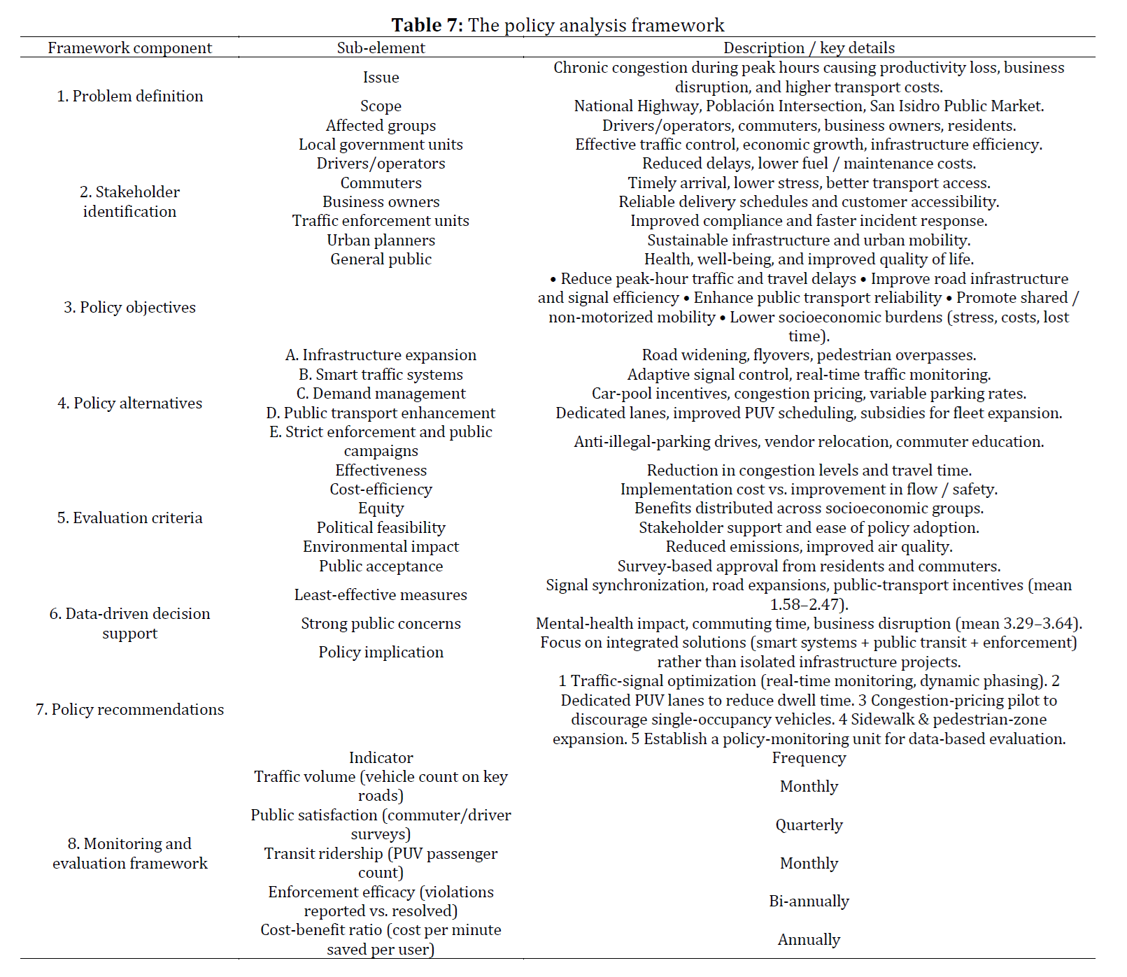 Traffic congestion, Socioeconomic impacts, Infrastructure, Public transport, Policy framework