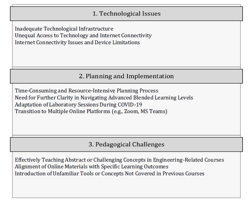 The COVID-19 pandemic accelerated the use of digital technologies, such as blended learning (BL), in higher education. These technologies support educators in designing personalized learning experiences and help digital-native students prepare for future leadership roles. This study used focus group discussions (FGDs) with three groups of higher education educators to explore their views on BL in engineering education. The FGDs included open-ended questions focusing on the complexities and challenges of adopting BL and on how technology might help address these issues. The transcripts of the discussions were carefully read several times, coded, categorized, and analyzed to identify key themes. In addition, the participants’ facial expressions were observed and considered in the analysis. Based on the findings, a design framework was developed for creating an online learning platform in engineering education. The results show that integrating BL into education provides significant benefits for both educators and students.
