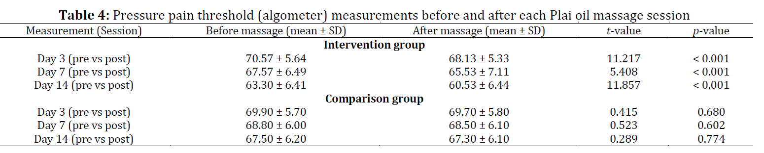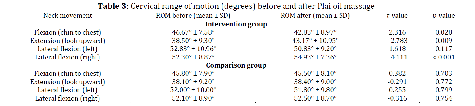 Neck and shoulder pain is a common musculoskeletal condition that restricts mobility and affects daily functioning. Although traditional Thai massage with herbal oils is widely practiced, scientific evidence on its effectiveness remains limited. This study examined the efficacy of Plai (Zingiber cassumunar) herbal massage oil in reducing neck and shoulder pain and improving cervical mobility. A two-group pretest–posttest design was conducted with 60 participants experiencing moderate pain, randomly assigned to either an intervention group receiving Plai oil massage for three consecutive days or a comparison group receiving standard health advice. Pain intensity (Numeric Rating Scale), cervical range of motion (ROM), and pressure pain threshold were assessed before and after treatment. Results showed that the intervention group had significant reductions in pain scores (p < 0.001), improved ROM, particularly in extension and right lateral flexion (p = 0.009 and p < 0.001), and increased pressure pain threshold (p < 0.001), whereas the comparison group showed no significant changes (p > 0.05). These findings indicate that Plai herbal massage oil is effective in relieving pain, enhancing mobility, and reducing muscle stiffness, supporting its role as a complementary therapy for musculoskeletal pain management.