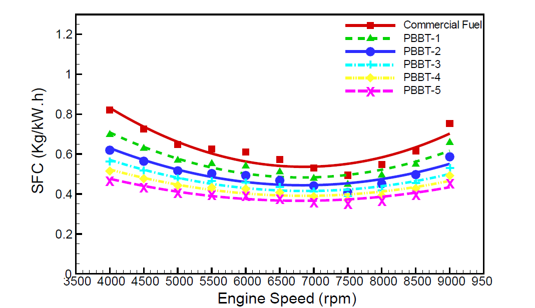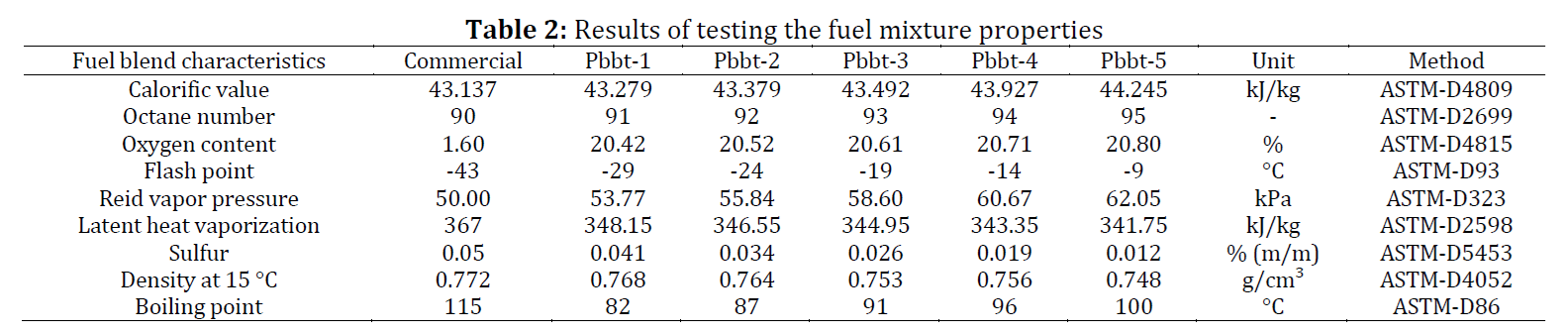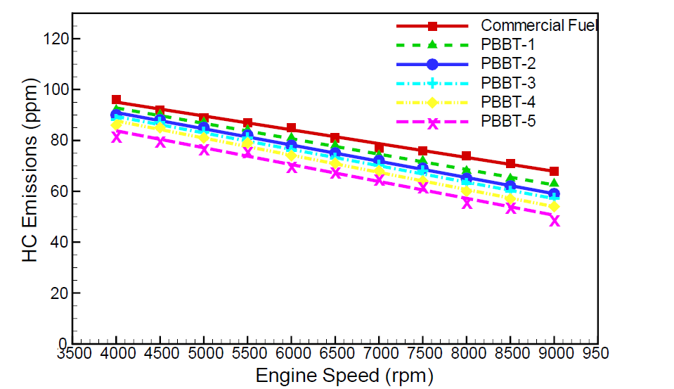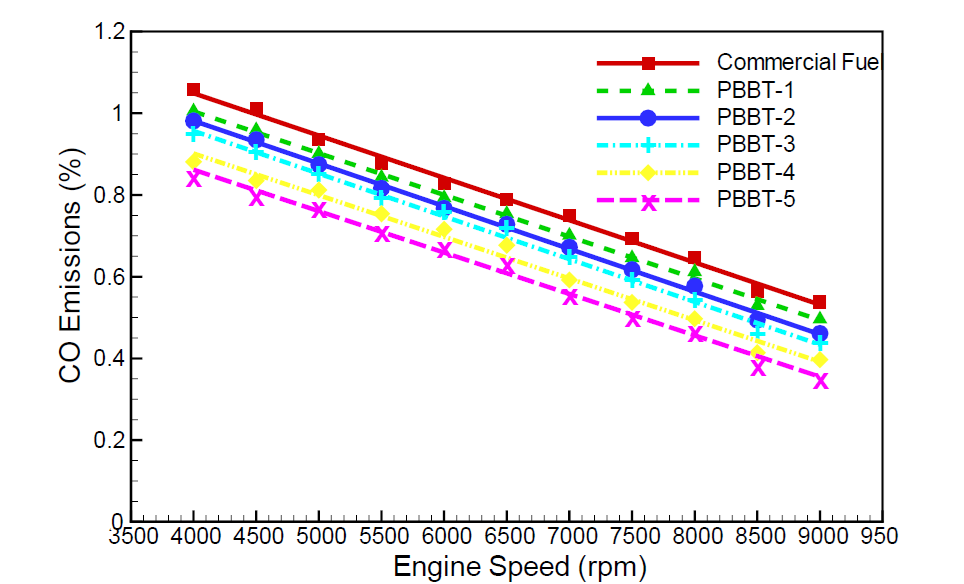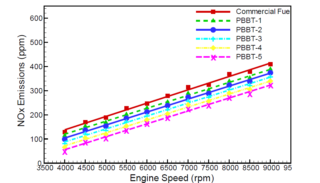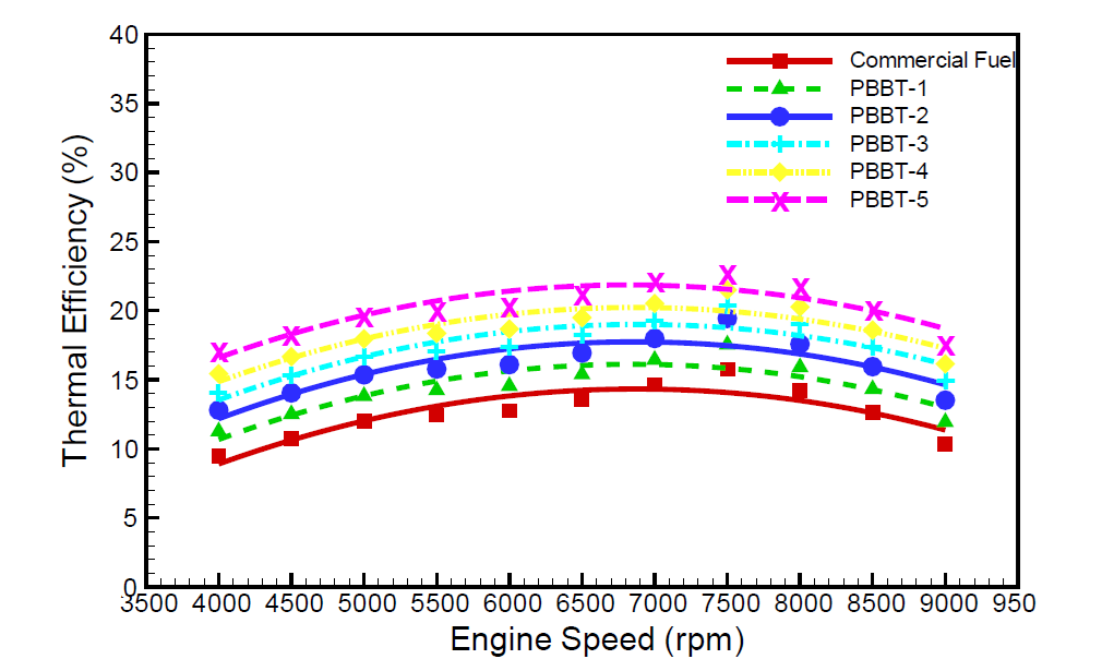The growing demand for low-emission and eco-friendly fuels has encouraged the development of multicomponent oxygenated blends for spark-ignition engines. This study evaluates the performance and emission characteristics of a single-cylinder, four-stroke gasoline engine with a 9.5:1 compression ratio using a newly formulated fuel blend called PBBT (Pertasol–n-Butanol–Butoxyethanol–Tamanu oil). The blend consists of 5% n-butanol, 5% 2-butoxyethanol, and 2–10% tamanu oil mixed into a Pertasol base. Experiments were conducted at engine speeds between 4000 and 9000 rpm under controlled conditions using a 50-L dynamometer and a four-gas analyzer. The results indicate notable improvements compared with conventional gasoline: the PBBT-5 blend achieved the highest thermal efficiency of 22.74% (a 44.4% increase), while CO and HC emissions decreased by more than 30%. NO x emissions were reduced by up to 15.40% with higher tamanu oil content. These improvements are attributed to the oxygenated components, which enhanced mixture homogeneity, combustion stability, and reduced peak combustion temperatures. Overall, the findings show that PBBT is a promising, cost-effective, and environmentally beneficial alternative fuel for spark-ignition engines.