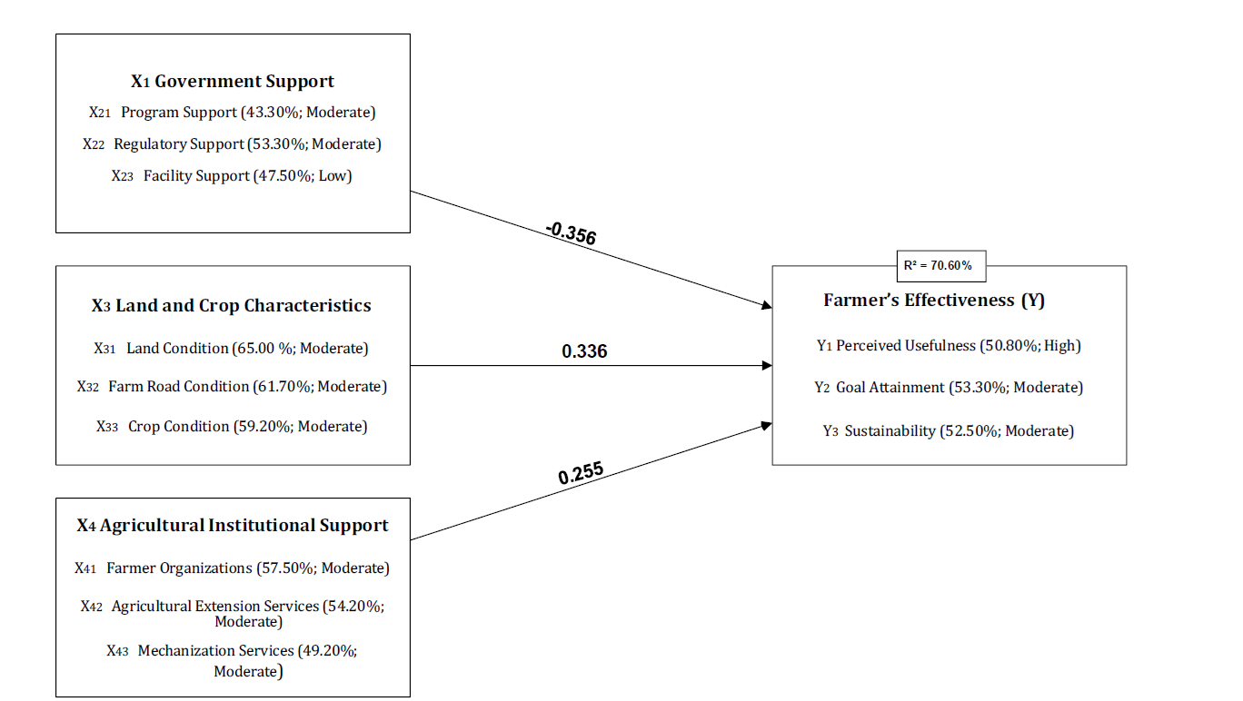 The use of combine harvesters is important for replacing manual labor, speeding up the harvesting process, reducing postharvest losses, and lowering operational costs, thereby improving the effectiveness and efficiency of rice harvesting. This study aimed to evaluate the performance and conformity of combine harvesters under different field conditions and to develop strategies to increase their use in rice harvesting. The research was conducted from April to June 2025 in the Lelea, Kroya, and Cikedung subdistricts of Indramayu Regency, Indonesia. Performance tests were carried out on rice fields that were ready for harvest, and data were collected from 120 farmer respondents. A quantitative research approach was used, with data analyzed using descriptive statistics and Partial Least Squares Structural Equation Modelling (PLS-SEM). The results showed that the combine harvester specifications conformed to Indonesian National Standard 8185:2019 by 91.67%. The operational efficiency of the combine harvesters was 63.57% in medium-depth fields and 68.11% in shallow fields. The average postharvest loss was 2.08 kg, including a header loss of 0.009% and a threshing loss of 0.001%. The PLS-SEM results indicated that government support, land and crop characteristics, and agricultural institutional support were the most significant factors influencing farmers’ effectiveness in using combine harvesters, together explaining 70.60% of the variance. Based on these findings, strategies were proposed to improve the utilization of combine harvesters by strengthening farmers’ effectiveness in Indramayu Regency.