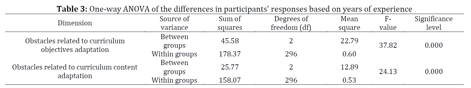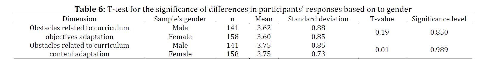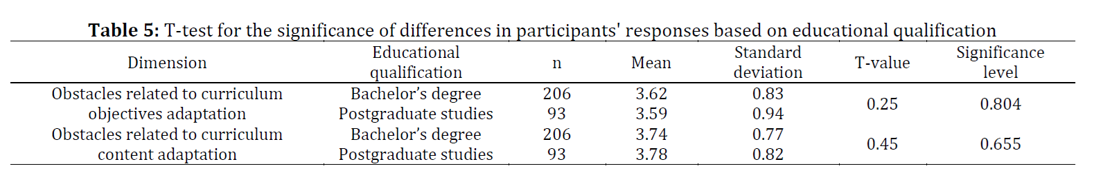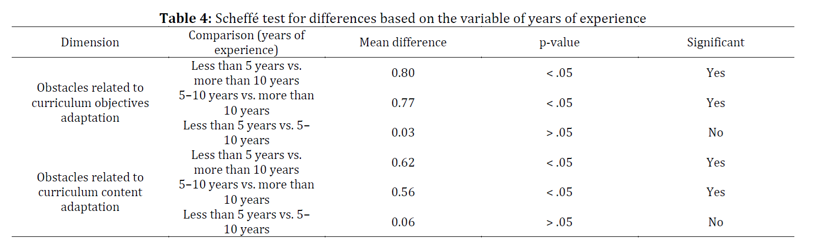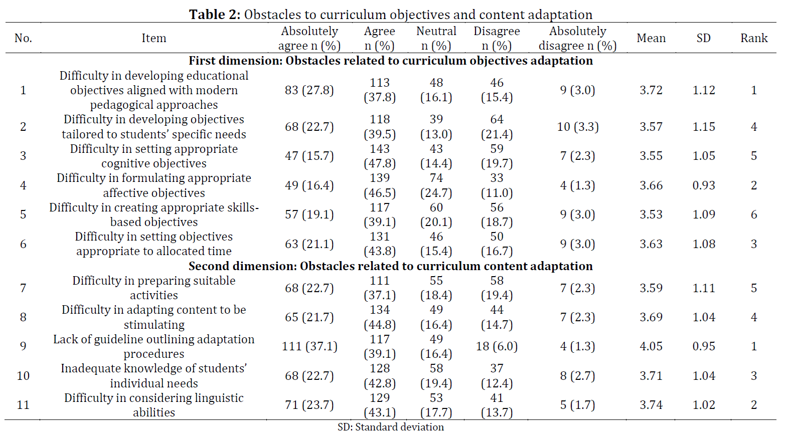 Curriculum adaptation of objectives and content plays an important role in improving the academic performance of students with learning disabilities and in achieving specific educational outcomes. Therefore, this study aims to examine the obstacles to adapting curriculum objectives and content from teachers’ perspectives. It also investigates whether there are significant differences in teachers’ views of these obstacles according to their years of experience, academic degree, and gender. The study adopts a descriptive survey method. A structured questionnaire was developed to collect data from a sample of 299 teachers working in public schools that offer learning disability programs in Riyadh, Saudi Arabia. The participants were selected using simple random sampling. The results indicate that teachers face several major obstacles in adapting curriculum objectives and content for students with learning disabilities. These obstacles were rated at a high level, with a mean score of 3.61 for curriculum objectives and 3.75 for curriculum content. The findings also show statistically significant differences in teachers’ responses based on years of experience, in favor of teachers with fewer years of experience. However, no statistically significant differences were found based on academic degree or gender.