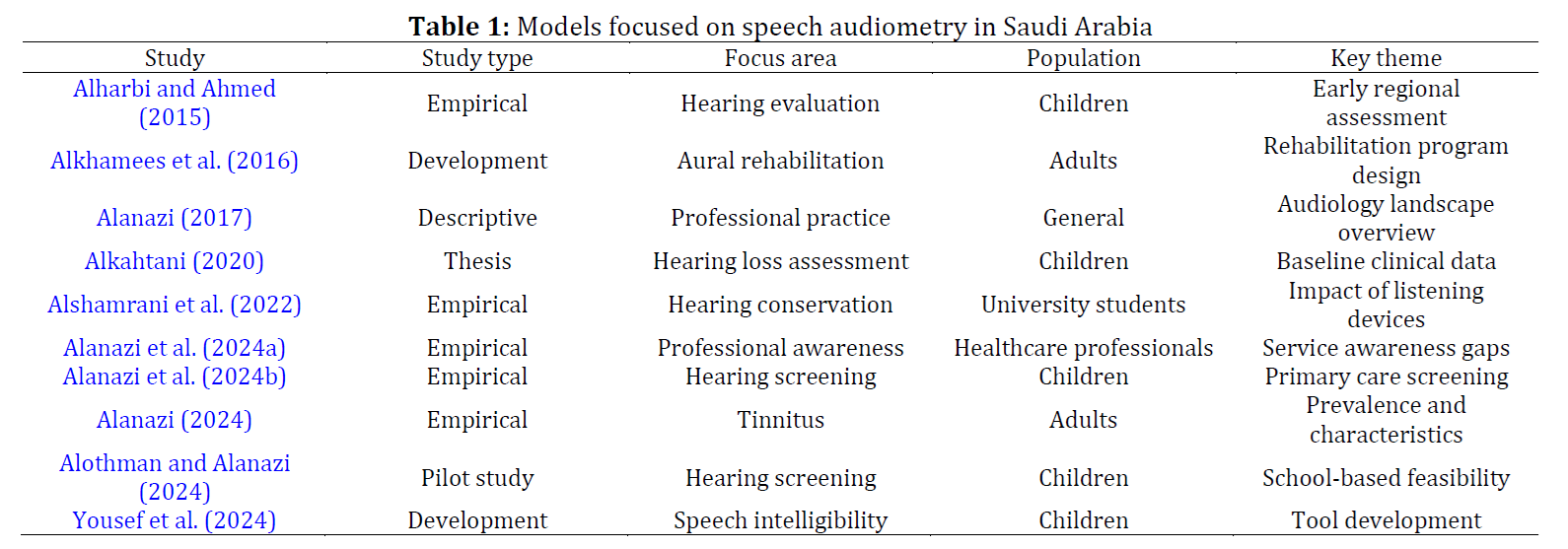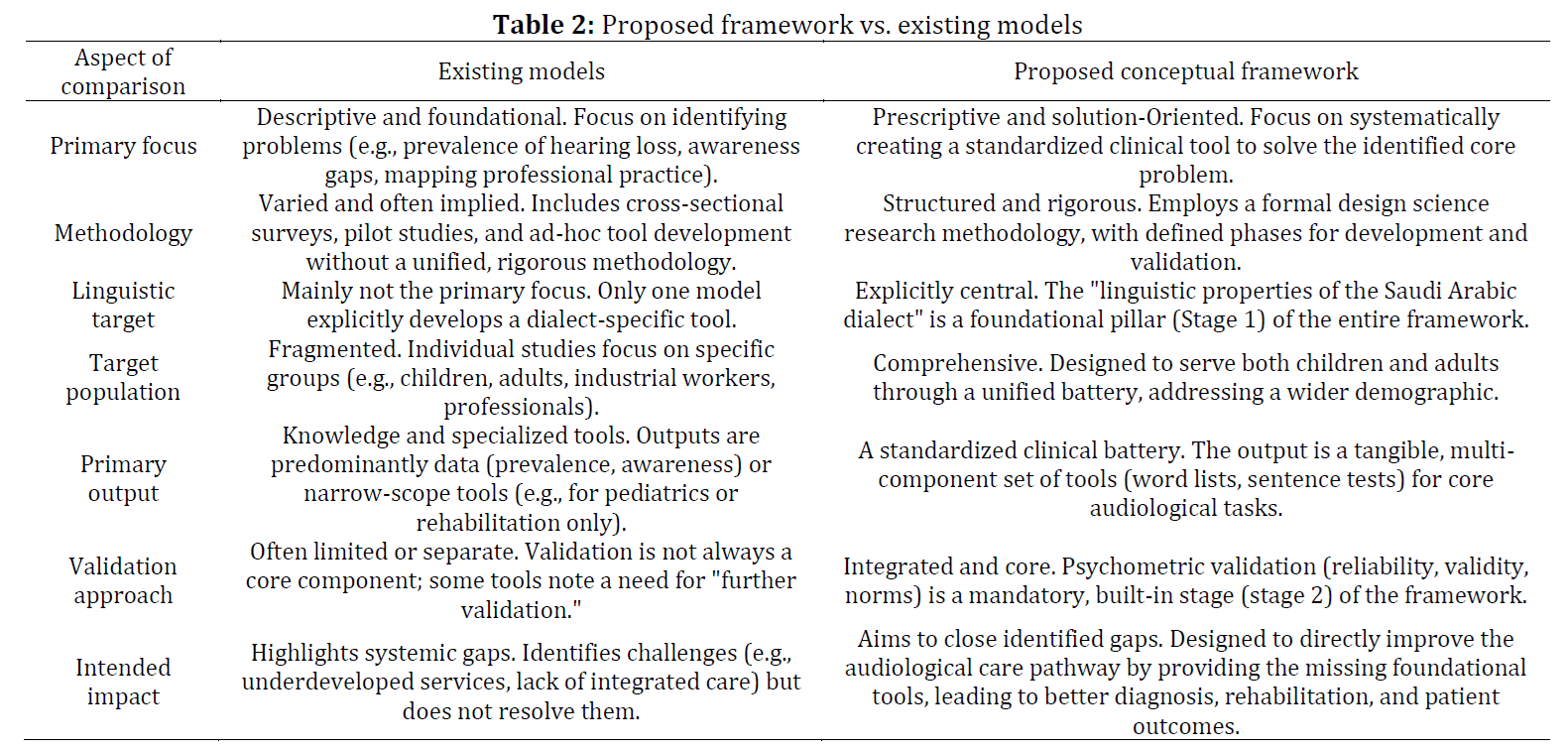 References (21)Abdulkader D (2024). Characterizing speech sound productions in Saudi Arabic and English bilingual children: Culturally informed and sensitive instrumental methods. Ph.D. Dissertation, University of Cincinnati, Cincinnati, USA. [Google Scholar] Al Matar W (2021). Speech audiometry: Arabic word recognition test for adults. Ph.D. Dissertation, Kent State University, Kent, USA. [Google Scholar] Alanazi AA (2017). Audiology and speech-language pathology practice in Saudi Arabia. International Journal of Health Sciences, 11(5): 43-55. [Google Scholar] Alanazi AA (2024). Tinnitus prevalence, associated characteristics, and treatment patterns among adults in Saudi Arabia. Audiology Research, 14(5): 760-777. https://doi.org/10.3390/audiolres14050064 [Google Scholar] PMid:39311217 PMCid:PMC11417728 Alanazi AA, ALHarbi MF, AlMutairi AM, AlRashied MA, and Abed R (2024a). Awareness of audiology and speech-language pathology services among healthcare professionals in Saudi Arabia. South African Journal of Communication Disorders, 71(1): a1043. https://doi.org/10.4102/sajcd.v71i1.1043 [Google Scholar] PMid:38949430 PMCid:PMC11219645 Alanazi AA, Almutairi RA, Alsuhaibani KS, Alruwaily Y, Alqudiey HA, Alabbas MA, and Alanazi SR (2024b). Exploration of preschool hearing screening at primary healthcare centers in Riyadh, Saudi Arabia: A cross-sectional study. Journal of Otology, 19(4): 214-219. https://doi.org/10.1016/j.joto.2024.10.001 [Google Scholar] PMid:39776543 PMCid:PMC11701338 Alfakir R, Hammady M, Afghah T, Abd Al-Ghaffar M, and Youssif M (2025). Translation, cultural adaptation, and validation of the HEAR-COMMAND Tool–Arabic: A self-rated ICF-based questionnaire for assessing hearing, communication, and conversation disability in Arabic-speaking populations. The Egyptian Journal of Otolaryngology, 41(1): 101-112. https://doi.org/10.1186/s43163-025-00832-4 [Google Scholar] Alharbi FA and Ahmed MR (2015). Evaluation of hearing among kindergarten children in Jazan (Kingdom of Saudi Arabia). Interventional Medicine and Applied Science, 7(3): 91-94. https://doi.org/10.1556/1646.7.2015.3.1 [Google Scholar] PMid:26527196 PMCid:PMC4609019 Alkahtani RA (2020). Assessment of sensorineural hearing loss in children in the Kingdom of Saudi Arabia. Ph.D. Dissertation, University of Southampton, Southampton, UK. [Google Scholar] Alkhamees A, Bryan K, and Mahon M (2016). Development of an auditory rehabilitation training programme for hearing impaired adults in Saudi Arabia. Journal of Health Science, 4(6): 304–317. https://doi.org/10.17265/2328-7136/2016.06.004 [Google Scholar] Alothman NI and Alanazi AA (2024). School-based hearing screening of first-grade students in Saudi Arabia: A pilot study. South African Journal of Communication Disorders, 71(1): a1063. https://doi.org/10.4102/sajcd.v71i1.1063 [Google Scholar] PMid:39625087 PMCid:PMC11622043 Alsebai SZ (2024). Assessment of speech recognition and quality of effusion in Arabic children. Ph.D. Dissertation, University of Southampton, Southampton, UK. [Google Scholar] Alshamrani R, Altheeb F, Almasaoud H, Alghamdi A, Latif R, Rafique N, and Sulaiman AA (2022). The effect of various patterns of personal listening devices on hearing among university students in Saudi Arabia. Acta Informatica Medica, 30(3): 225-229. https://doi.org/10.5455/aim.2022.30.225-229 [Google Scholar] PMid:36311152 PMCid:PMC9560056 Hevner AR, March ST, Park J, and Ram S (2004). Design science in information systems research. MIS Quarterly, 28(1): 75-105. https://doi.org/10.2307/25148625 [Google Scholar] Honu-Mensah CM (2015). Development and evaluation of psychometrically equivalent trisyllabic words for speech audiometry in Fante. Ph.D. Dissertation, University of Ghana, Accra, Ghana. [Google Scholar] Hull M (2016). Medical language proficiency: A discussion of interprofessional language competencies and potential for patient risk. International Journal of Nursing Studies, 54: 158-172. https://doi.org/10.1016/j.ijnurstu.2015.02.015 [Google Scholar] PMid:25863658 Parmar B and Rajasingam S (2023). Adult speech testing in the UK. ENT & Audiology News, 32(2): 32-34. [Google Scholar] Parmar BJ, Rajasingam SL, Bizley JK, and Vickers DA (2022). Factors affecting the use of speech testing in adult audiology. American Journal of Audiology, 31(3): 528-540. https://doi.org/10.1044/2022_AJA-21-00233 [Google Scholar] PMid:35737980 PMCid:PMC7613483 Rayes HHH (2021). The development and evaluation of the hearing intervention battery in Arabic (HIBA) for auditory perception in children with cochlear implants. Ph.D. Dissertation, University College London, London, UK. [Google Scholar] Sarkis-Onofre R, Catalá-López F, Aromataris E, and Lockwood C (2021). How to properly use the PRISMA statement. Systematic Reviews, 10: 117. https://doi.org/10.1186/s13643-021-01671-z [Google Scholar] PMid:33875004 PMCid:PMC8056687 - Yousef M, Mesallam T, Abdelsamad Y, Alkhamiss S, Alotaibi T, Alsanosi S, and Alsanosi A (2024). Development and cultural adaptation of the Saudi pediatric speech intelligibility test. Saudi Medical Journal, 45(11): 1260-1264. https://doi.org/10.15537/smj.2024.45.11.20240539 [Google Scholar] PMid:39510566 PMCid:PMC11549608
