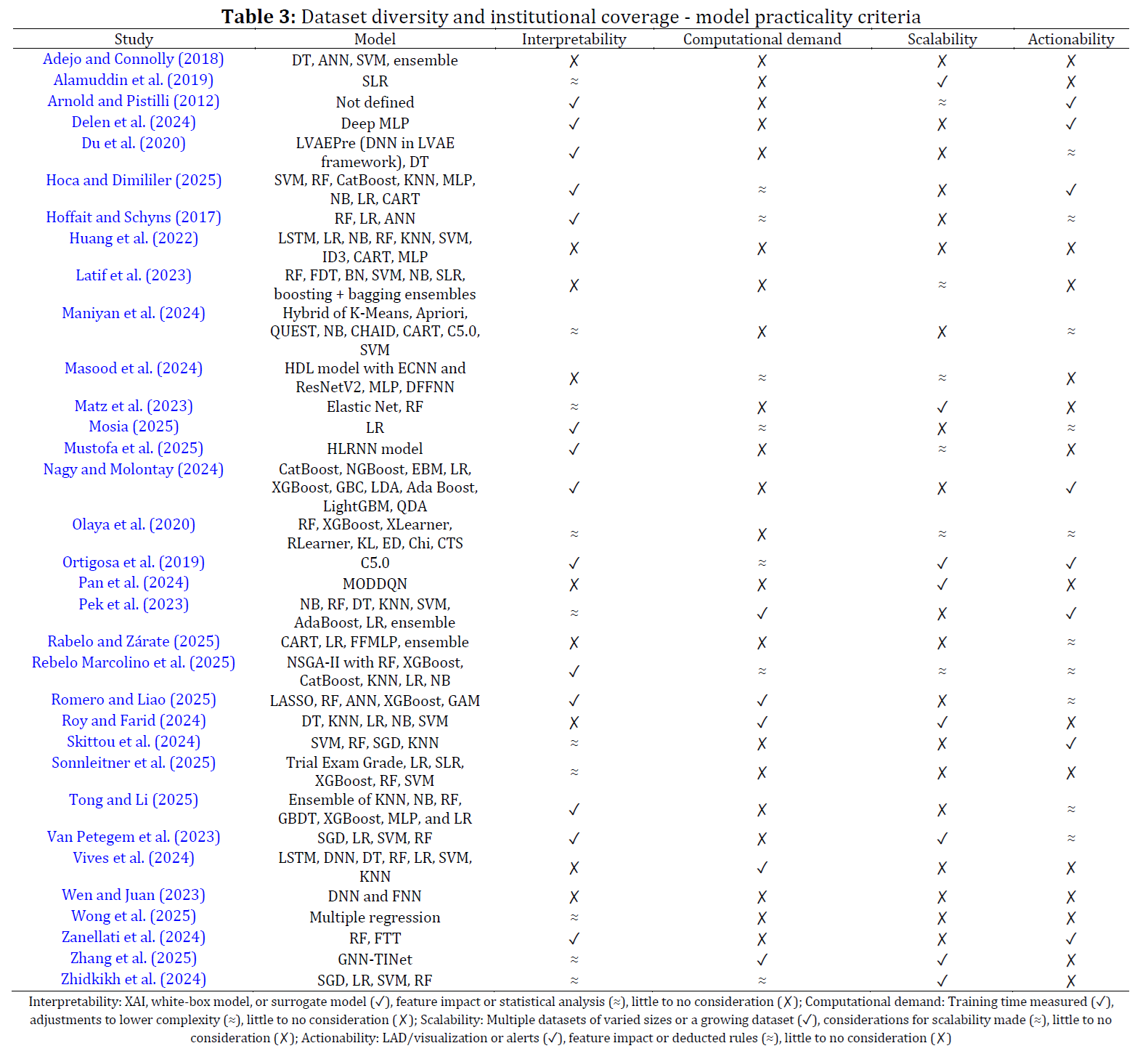 Learning analytics, Dropout prediction, Model practicality, Interpretability, Computational feasibility
