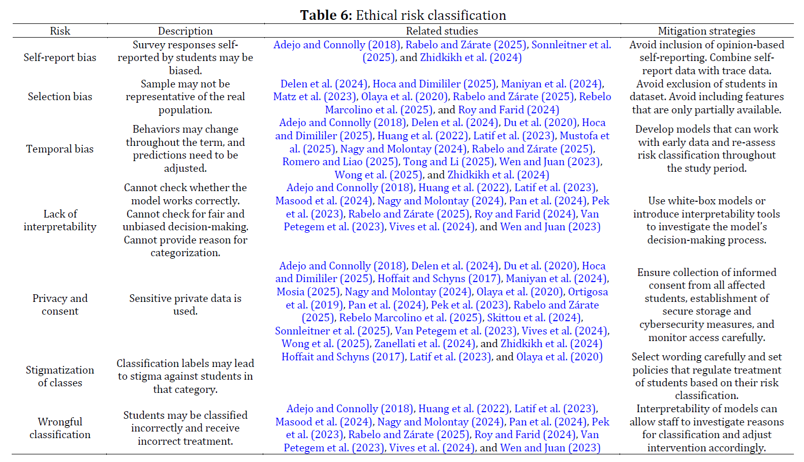 References (53)Adejo OW and Connolly T (2018). Predicting student academic performance using multi-model heterogeneous ensemble approach. Journal of Applied Research in Higher Education, 10(1): 61-75. https://doi.org/10.1108/JARHE-09-2017-0113 [Google Scholar] Alamuddin R, Rossman D, and Kurzweil M (2019). Interim findings report from the MAAPS advising experiment. ITHAKA S+ R Report, Ithaka S+R, New York, USA. https://doi.org/10.18665/sr.311567 [Google Scholar] Arnold KE and Pistilli MD (2012). Course signals at Purdue: Using learning analytics to increase student success. In the Proceedings of the 2nd International Conference on Learning Analytics and Knowledge, Association for Computing Machinery, Vancouver, Canada: 267–270. https://doi.org/10.1145/2330601.2330666 [Google Scholar] PMid:22496114 Barbeiro L, Gomes A, Correia FB, and Bernardino J (2024). A review of educational data mining trends. Procedia Computer Science, 237: 88-95. https://doi.org/10.1016/j.procs.2024.05.083 [Google Scholar] Collberg C and Proebsting TA (2016). Repeatability in computer systems research. Communications of the ACM, 59(3): 62-69. https://doi.org/10.1145/2812803 [Google Scholar] Cortez P and Silva A (2008). Student performance. UCI Machine Learning Repository, Irvine, USA. [Google Scholar] Delen D, Davazdahemami B, and Rasouli Dezfouli E (2024). Predicting and mitigating freshmen student attrition: A local-explainable machine learning framework. Information Systems Frontiers, 26: 641-662. https://doi.org/10.1007/s10796-023-10397-3 [Google Scholar] PMid:37361887 PMCid:PMC10097523 Du X, Yang J, and Hung JL (2020). An integrated framework based on latent variational autoencoder for providing early warning of at-risk students. IEEE Access, 8: 10110-10122. https://doi.org/10.1109/ACCESS.2020.2964845 [Google Scholar] Fahd K, Venkatraman S, Miah SJ, and Ahmed K (2022). Application of machine learning in higher education to assess student academic performance, at-risk, and attrition: A meta-analysis of literature. Education and Information Technologies, 27: 3743-3775. https://doi.org/10.1007/s10639-021-10741-7 [Google Scholar] Gundersen OE (2021). The fundamental principles of reproducibility. Philosophical Transactions of the Royal Society A, 379(2197): 20200210. https://doi.org/10.1098/rsta.2020.0210 [Google Scholar] PMid:33775150 Hoca S and Dimililer N (2025). A machine learning framework for student retention policy development: A case study. Applied Sciences, 15(6): 2989. https://doi.org/10.3390/app15062989 [Google Scholar] Hoffait AS and Schyns M (2017). Early detection of university students with potential difficulties. Decision Support Systems, 101: 1-11. https://doi.org/10.1016/j.dss.2017.05.003 [Google Scholar] Huang H, Yuan S, He T, and Hou R (2022). Use of behavior dynamics to improve early detection of at-risk students in online courses. Mobile Networks and Applications, 27: 441-452. https://doi.org/10.1007/s11036-021-01844-z [Google Scholar] Kuzilek J, Hlosta M, and Zdrahal Z (2017). Open university learning analytics dataset. Scientific Data, 4: 170171. https://doi.org/10.1038/sdata.2017.171 [Google Scholar] PMid:29182599 PMCid:PMC5704676 Latif G, Abdelhamid SE, Fawagreh KS, Brahim GB, and Alghazo R (2023). Machine learning in higher education: Students’ performance assessment considering online activity logs. IEEE Access, 11: 69586-69600. https://doi.org/10.1109/ACCESS.2023.3287972 [Google Scholar] Loyola-González O (2019). Black-box vs. white-box: Understanding their advantages and weaknesses from a practical point of view. IEEE Access, 7: 154096-154113. https://doi.org/10.1109/ACCESS.2019.2949286 [Google Scholar] Maniyan S, Ghousi R, and Haeri A (2024). Data mining-based decision support system for educational decision makers: Extracting rules to enhance academic efficiency. Computers and Education: Artificial Intelligence, 6: 100242. https://doi.org/10.1016/j.caeai.2024.100242 [Google Scholar] Masood JAIS, Chakravarthy NK, Asirvatham D, Marjani M, Shafiq DA, and Nidamanuri S (2024). A hybrid deep learning model to predict high-risk students in virtual learning environments. IEEE Access, 12: 103687-103703. https://doi.org/10.1109/ACCESS.2024.3434644 [Google Scholar] Matz SC, Bukow CS, Peters H, Deacons C, Dinu A, and Stachl C (2023). Using machine learning to predict student retention from socio-demographic characteristics and app-based engagement metrics. Scientific Reports, 13: 5705. https://doi.org/10.1038/s41598-023-32484-w [Google Scholar] PMid:37029155 PMCid:PMC10082180 Memarian B and Doleck T (2023). Fairness, accountability, transparency, and ethics (FATE) in artificial intelligence (AI) and higher education: A systematic review. Computers and Education: Artificial Intelligence, 5: 100152. https://doi.org/10.1016/j.caeai.2023.100152 [Google Scholar] Molla-Esparza C, Gómez-Núñez MI, and García-García FJ (2025). Applications of learning analytics in the study of academic performance in higher education: A pilot-tested meta-review protocol. International Journal of Educational Research Open, 8: 100433. https://doi.org/10.1016/j.ijedro.2024.100433 [Google Scholar] Mosia M (2025). A Bayesian state-space approach to dynamic hierarchical logistic regression for evolving student risk in educational analytics. Data, 10(2): 23. https://doi.org/10.3390/data10020023 [Google Scholar] Mustofa S, Emon YR, Mamun SB, Akhy SA, and Ahad MT (2025). A novel AI-driven model for student dropout risk analysis with explainable AI insights. Computers and Education: Artificial Intelligence, 8: 100352. https://doi.org/10.1016/j.caeai.2024.100352 [Google Scholar] Nabil A, Seyam M, and Abou-Elfetouh A (2021). Prediction of students’ academic performance based on courses’ grades using deep neural networks. IEEE Access, 9: 140731-140746. https://doi.org/10.1109/ACCESS.2021.3119596 [Google Scholar] Nagy M and Molontay R (2024). Interpretable dropout prediction: Towards XAI-based personalized intervention